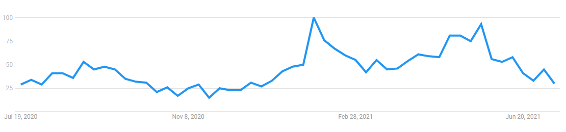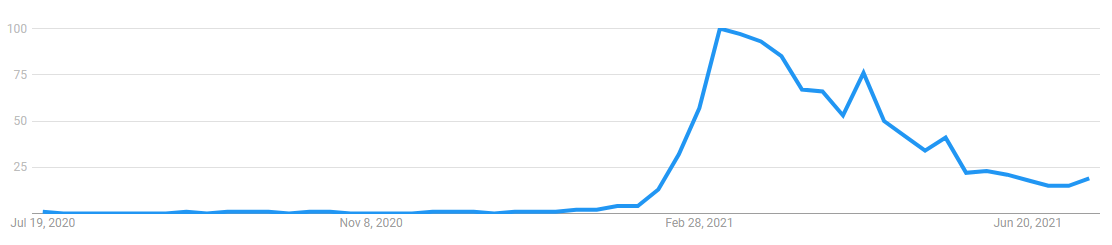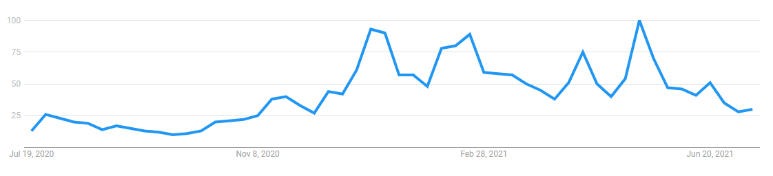 Looking “DeFi” in Google Developments produces the next chart, which really exhibits a spike within the variety of queries across the identical time because the market cap of DeFi tokens started to extend.