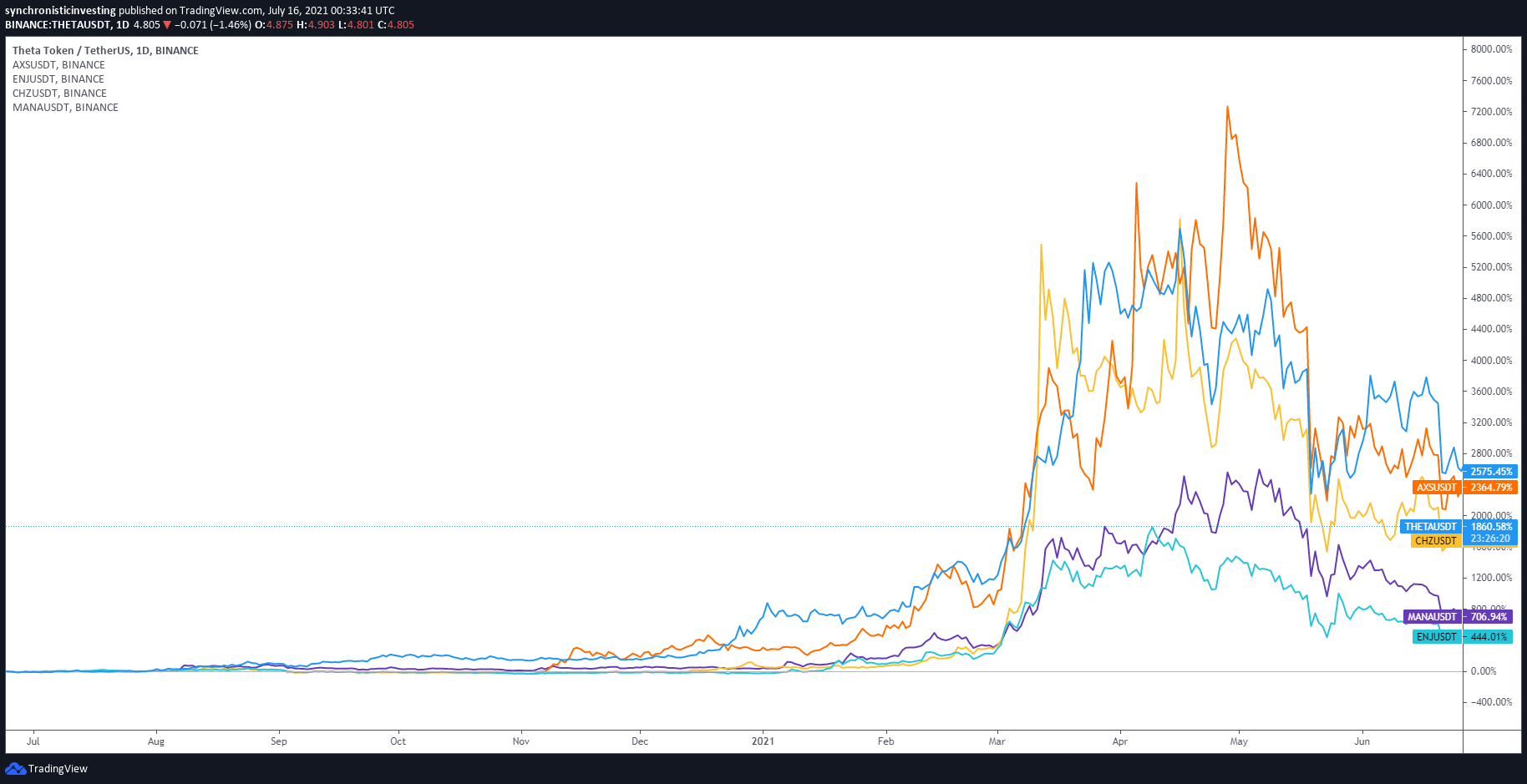 A number of the greatest month-to-month positive factors from NFT initiatives embrace a 443% achieve within the value of THETA between March 1 and 21, and a 530% achieve within the value of Axie Infinity Shards (AXS) from Feb. 23 to March 15. Chiliz (CHZ) noticed a 3,690% surge in value between Feb. 13 and March 13.