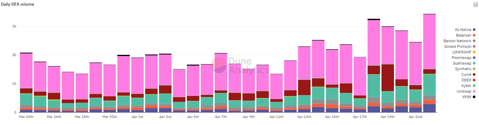 As seen on the chart above, the every day DEX quantity reached its highest degree in weeks on April 22 as Bitcoin and the broader cryptocurrency market underwent a major downturn that noticed the whole market capitalization fall by greater than $324 million.