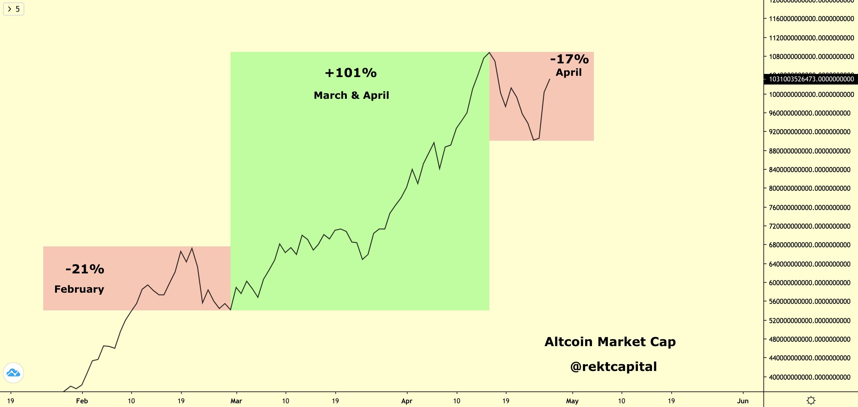 “This latest restoration in Altcoin Market Cap is far sharper than the post-retrace restoration in February,” fashionable Twitter account Rekt Capital commented on Tuesday, evaluating completely different retracements in 2021.