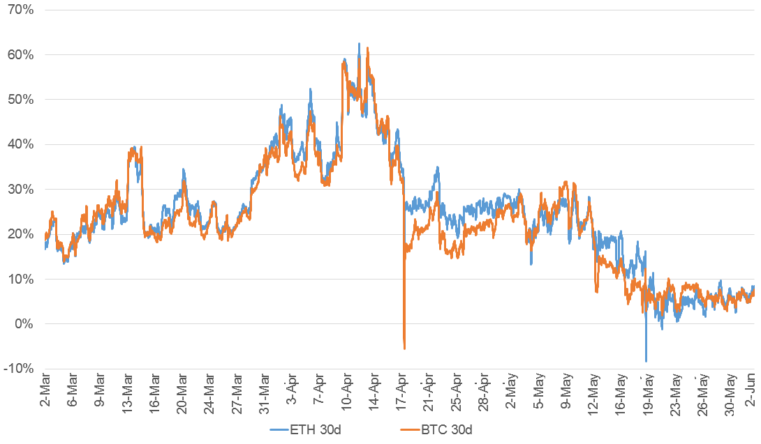 As depicted above, the futures premium has been beneath 10% for the reason that Might 19 crash for each Bitcoin and Ether. This means a slight bearishness, though removed from a unfavourable indicator, referred to as backwardation.