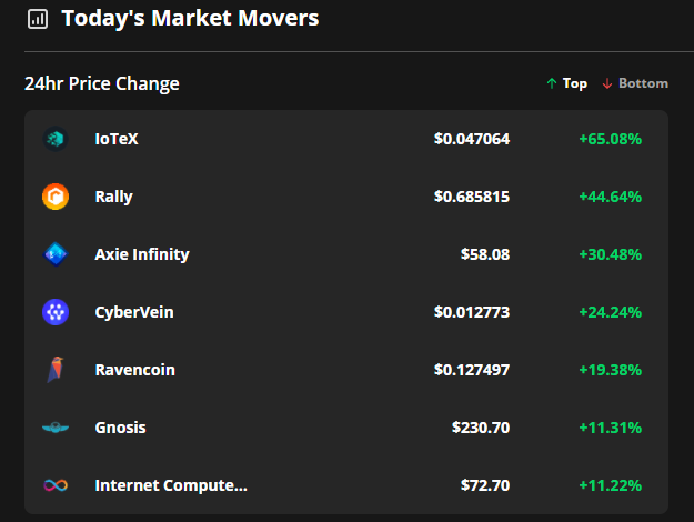 Knowledge from Cointelegraph Markets Professional and TradingView reveals that the most important gainers over the previous 24-hours had been IoTeX (IOTX), Rally (RLY) and Axie Infinity (AXS).