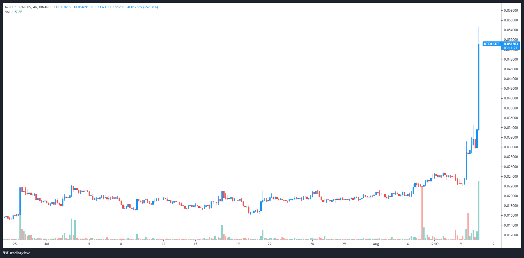 Knowledge from Cointelegraph Markets Professional and TradingView reveals that the worth of IOTX has now rallied 150% from a low of $0.0213 within the early buying and selling hours on Aug. 9 to an intraday excessive at $0.0529 on Tuesday.