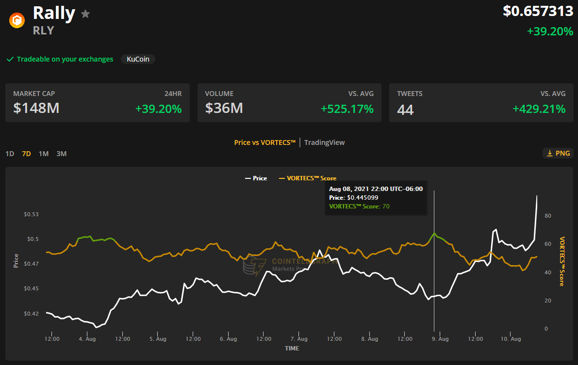 As seen in the chart above, the VORTECS™ Score for RLY spiked into the green on Aug. 8 and reached a high score of 70 around five hours before its price increased 81% over the next two days.