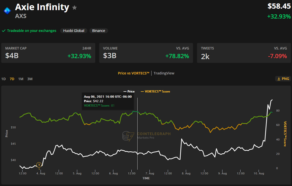 VORTECS™ data from Cointelegraph Markets Pro began to detect a bullish outlook for AXS on Aug. 7, prior to the recent price rise.