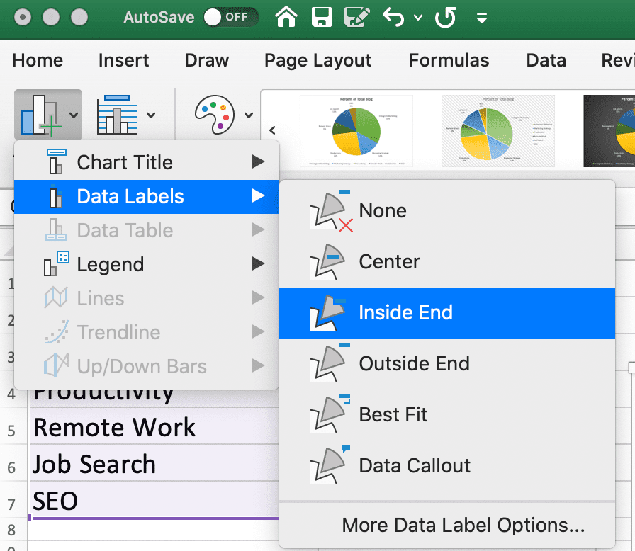 7. On the identical three bar graph icon, click on “Information Labels” to switch the place your labels seem on the pie chart. (For example, would you like the pie chart items labelled in the midst of every pie chart portion, or on the skin?)