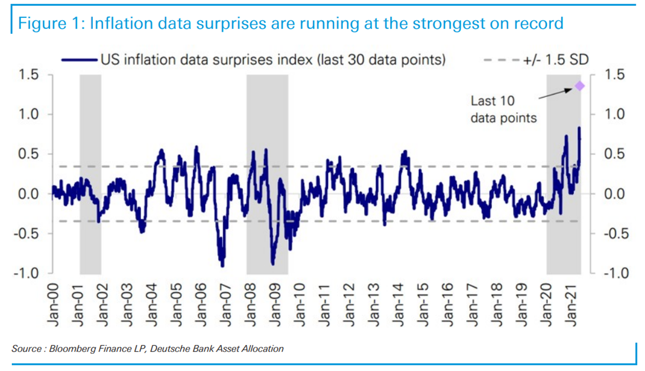 All these economists who went together with the Fed’s inflation-is-temporary-and-going-per-plan narrative are surprised by the information they now see coming in. They shouldn’t be, because it was predicable. Nonetheless, they might want to get greater charts to make room for it. Discover the place the final ten information factors for the rise in inflationary surprises are positioned (look as much as the far, prime proper nook of the chart):