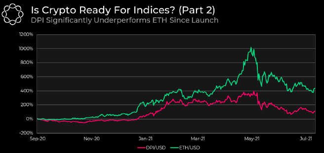 When evaluating the efficiency of DPI to Ether for the reason that inception of the index, Ether considerably outperformed by way of profitability and volatility, as evidenced by a 57% drawdown on Ether versus 65% for DPI.