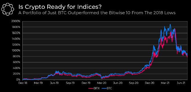 The index did supply much less draw back threat to traders because the market sold-off in Could however the distinction was “trivial” as “BTC’s max drawdown was 53% and Bitwise’s was 50%.”