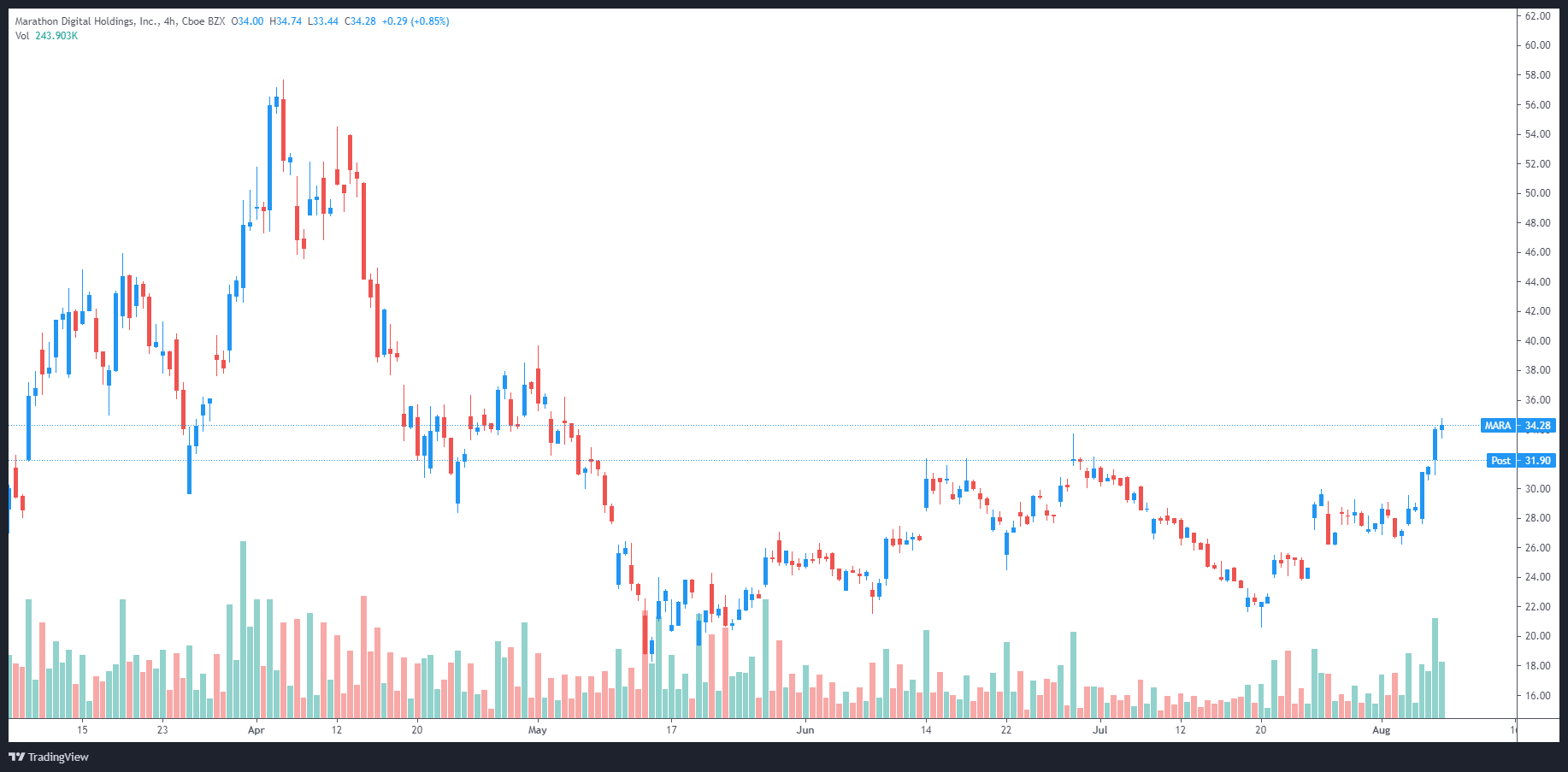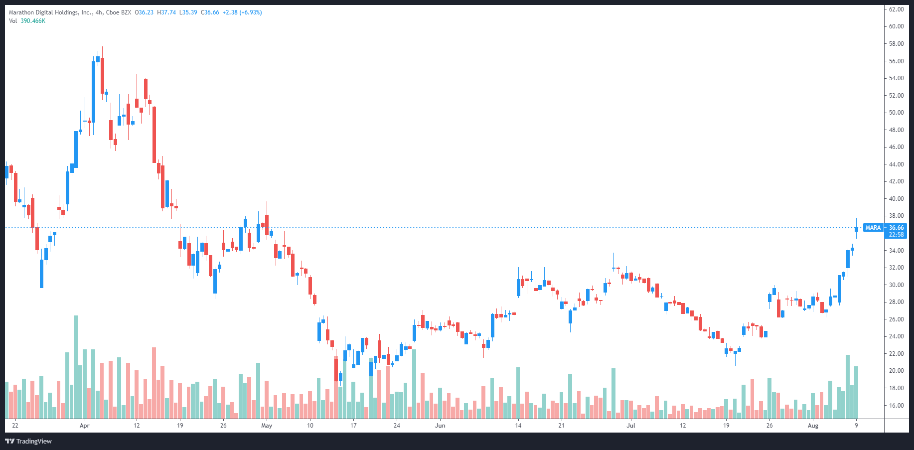Information from TradingView reveals that after reaching a low of $20.52 on July 20, the worth of MARA has rallied 83% to an intraday excessive of $37.77 on Aug. 6, making MARA the top-performing Bitcoin mining inventory over the previous two weeks.