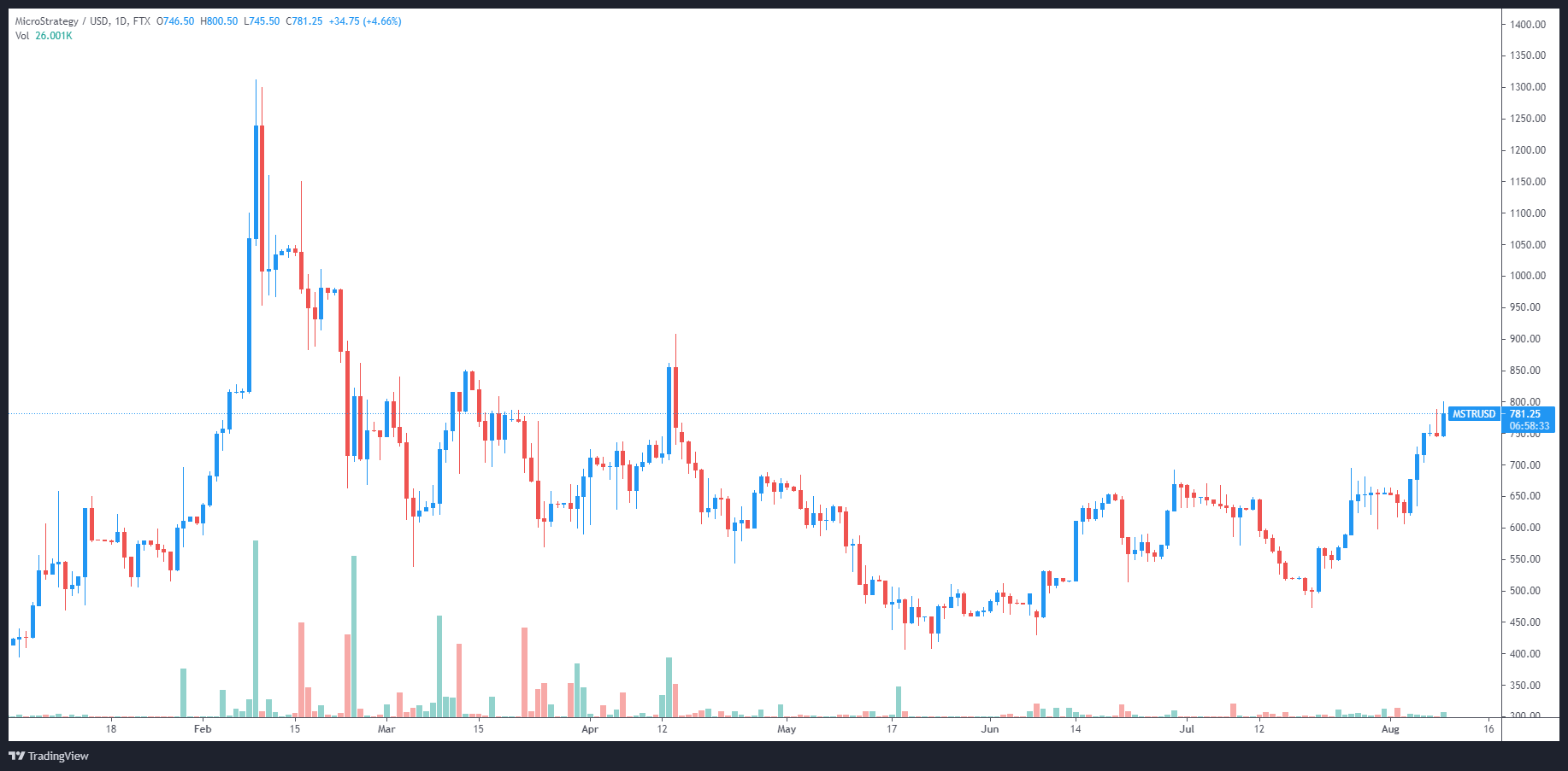 As seen within the chart above, the worth of MSTR reached a low of $474 on July 20, the identical day because the low in Bitcoin, and has since elevated 65% to commerce at $781.
