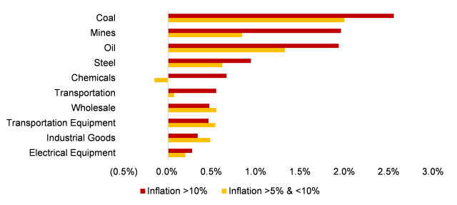 The identical sectors didn’t uniformly underperform when inflation hovered between 5% and 10%. Some even generated constructive returns. In distinction, the sectors that almost all benefitted from excessive inflation had been virtually equivalent in the course of the two larger inflation regimes: particularly, vitality and supplies, which buyers usually depend on when positioning fairness portfolios for larger inflation.