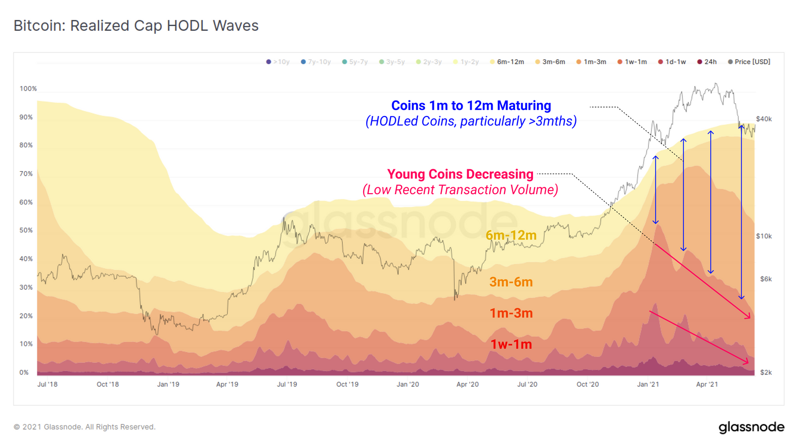 HODL waves affirm that, partially because of low volatility, the Bitcoin provide is ageing, and few traders are promoting.