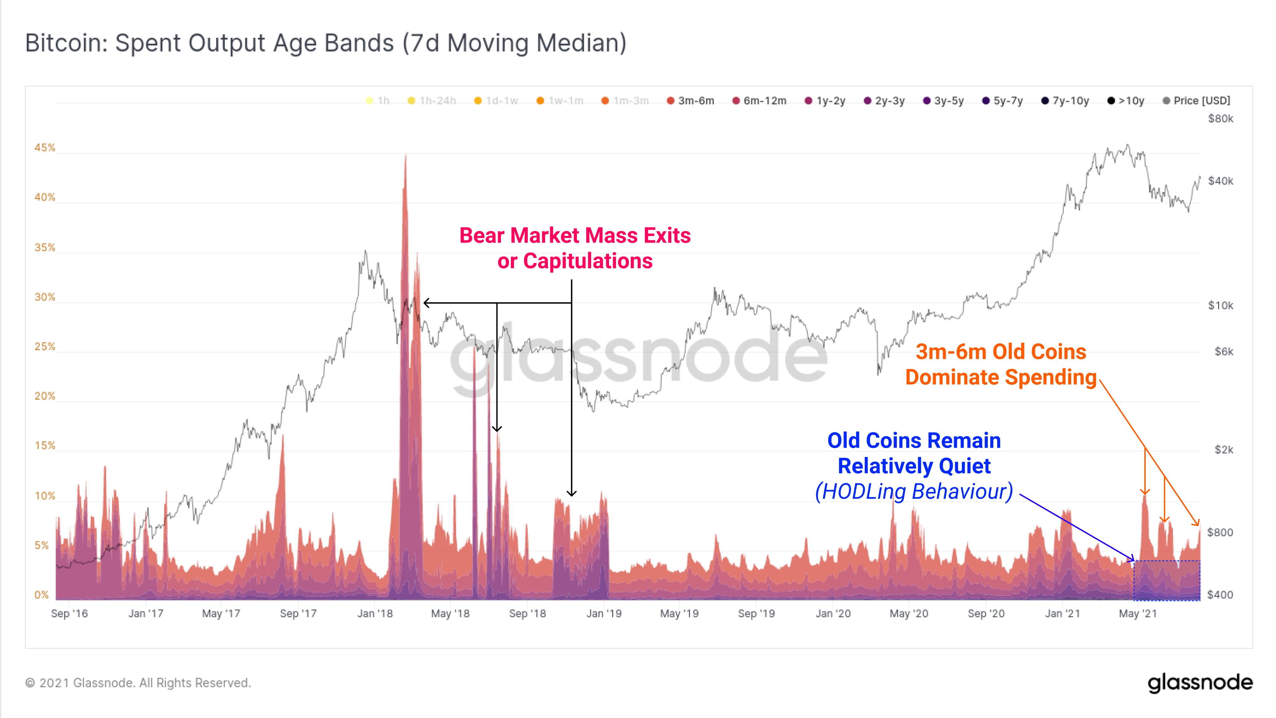 “Regardless of a robust rally to $45k, the Bitcoin market nonetheless has not seen a big improve in outdated cash (>1y) being spent. That is very completely different to the 2018 bear market the place outdated fingers took exit liquidity on most aid rallies.”