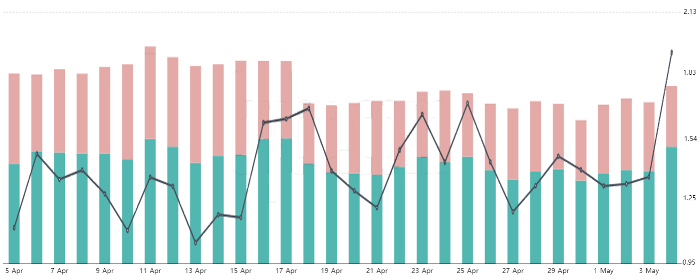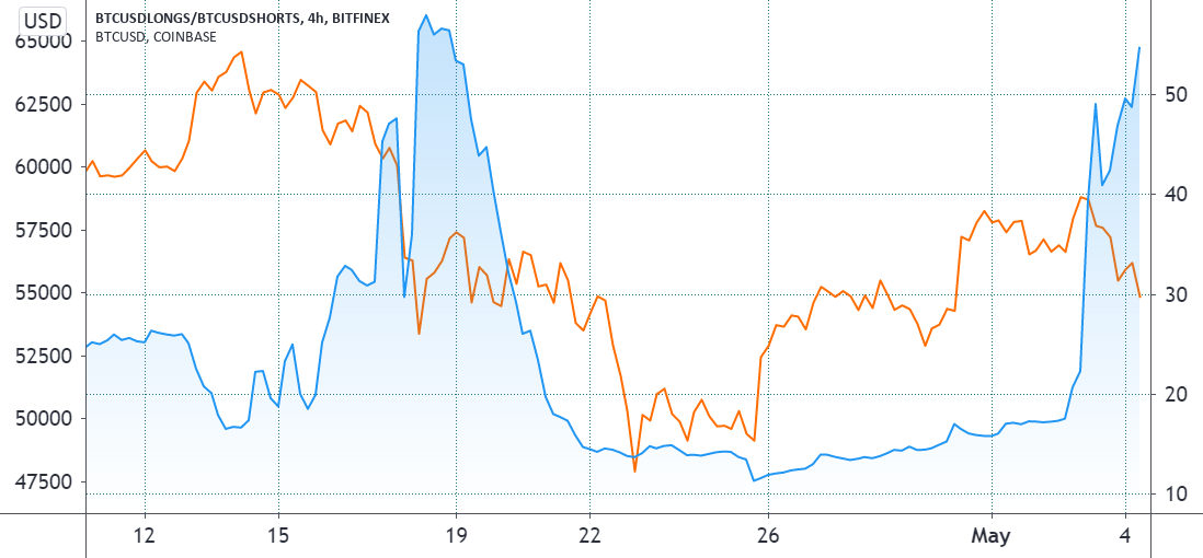 As proven above, the present OKEx futures long-to-short ratio presently favors longs by 94%. This shopping for exercise was initiated within the early hours of Might 4 as Bitcoin broke under $55,000. Extra importantly, it alerts much more confidence than April 14 when BTC hiked to its $64,900 all-time excessive.