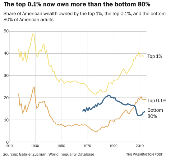 Ten p.c of People now management 97 p.c of all capital revenue within the nation. Practically half of the brand new revenue generated for the reason that international monetary disaster of 2008 has gone to the wealthiest one p.c of U.S. residents. The richest three People collectively have extra wealth than the poorest 160 million People.