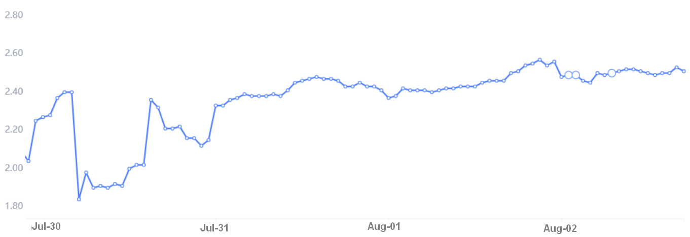 The above chart exhibits that merchants have been borrowing extra Tether not too long ago, because the ratio elevated from 2.00 on July 30 to 2.50. The information leans bullish in absolute phrases as a result of the indicator favors stablecoin borrowing by 2.5 occasions. It additionally exhibits resilience within the face of the current BTC value drop.