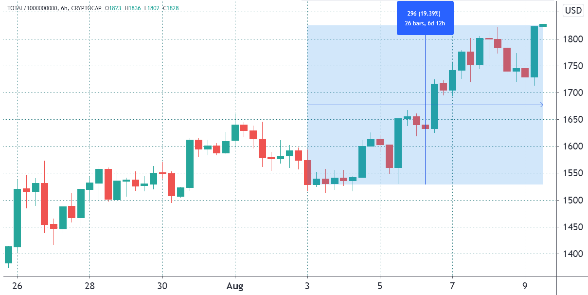 This week the entire cryptocurrency market capitalization bounced again to $1.9 trillion, which was a 20% weekly improve and the best stage seen since Might 20.