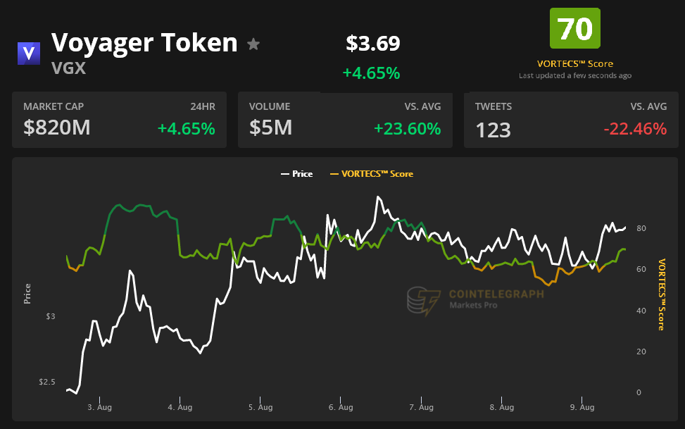 The VORTECS™ Rating, unique to Cointelegraph, is an algorithmic comparability of historic and present market circumstances derived from a mix of knowledge factors, together with market sentiment, buying and selling quantity, latest value actions and Twitter exercise.