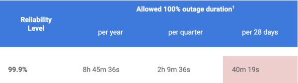 The service degree indicator (SLI) on this instance is a request finishing with a standing code of 2xx, 3xx or 4xx and with a response time of at most 2000ms. The SLO is the goal proportion, 99.9%. We attain our SLO aim if, throughout a 30 day interval, 99.9% of all requests accomplished with a kind of standing codes and inside that vary of latency. If our service didn’t succeed at that aim, the violation overflow — referred to as an “error price range” — exhibits us by how a lot we fell brief. With a aim of 99.9%, we have now 40 minutes and 19 seconds of downtime accessible to us each 28 days. Try extra error price range math right here.