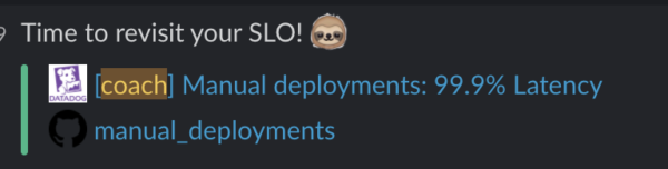 The SRE group has a web-app and CLI referred to as `coach` that we use to handle steady integration (CI) and steady supply (CD), amongst different issues. We’ve talked about Coach prior to now right here and right here. At a excessive degree, the Coach CLI generates lots of yaml recordsdata which might be utilized in all kinds of locations to assist handle operational complexity and cloud assets for consumer-facing web-apps. Within the case of service degree indicators (mainly metrics assortment), the Coach CLI supplies instructions that generate yaml recordsdata to be saved in GitHub alongside utility code. At deploy time, the Coach web-app consumes these recordsdata and idempotently create Datadog displays, which can be utilized as SLIs (service degree indicators) to tell SLOs, or as standalone alerts that want quick triage each time they’re triggered.